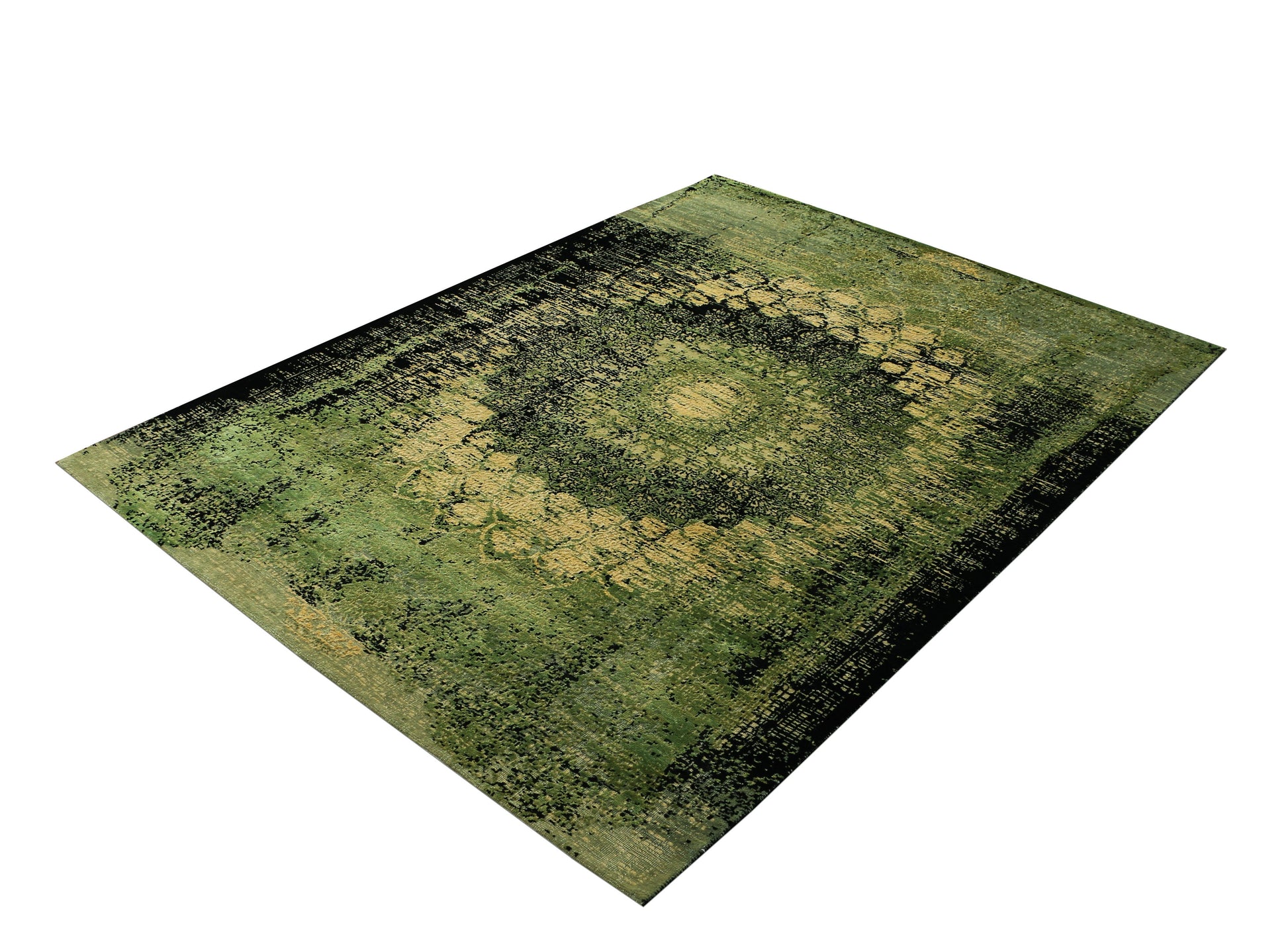 Traditional Medallion Design: A central, faded medallion pattern provides a classical foundation, while the distressed finish abstracts the design, giving it a modern, almost impressionistic appeal. The intricate, geometric borders appear dissolved, lending an artistic, painterly quality to the piece.