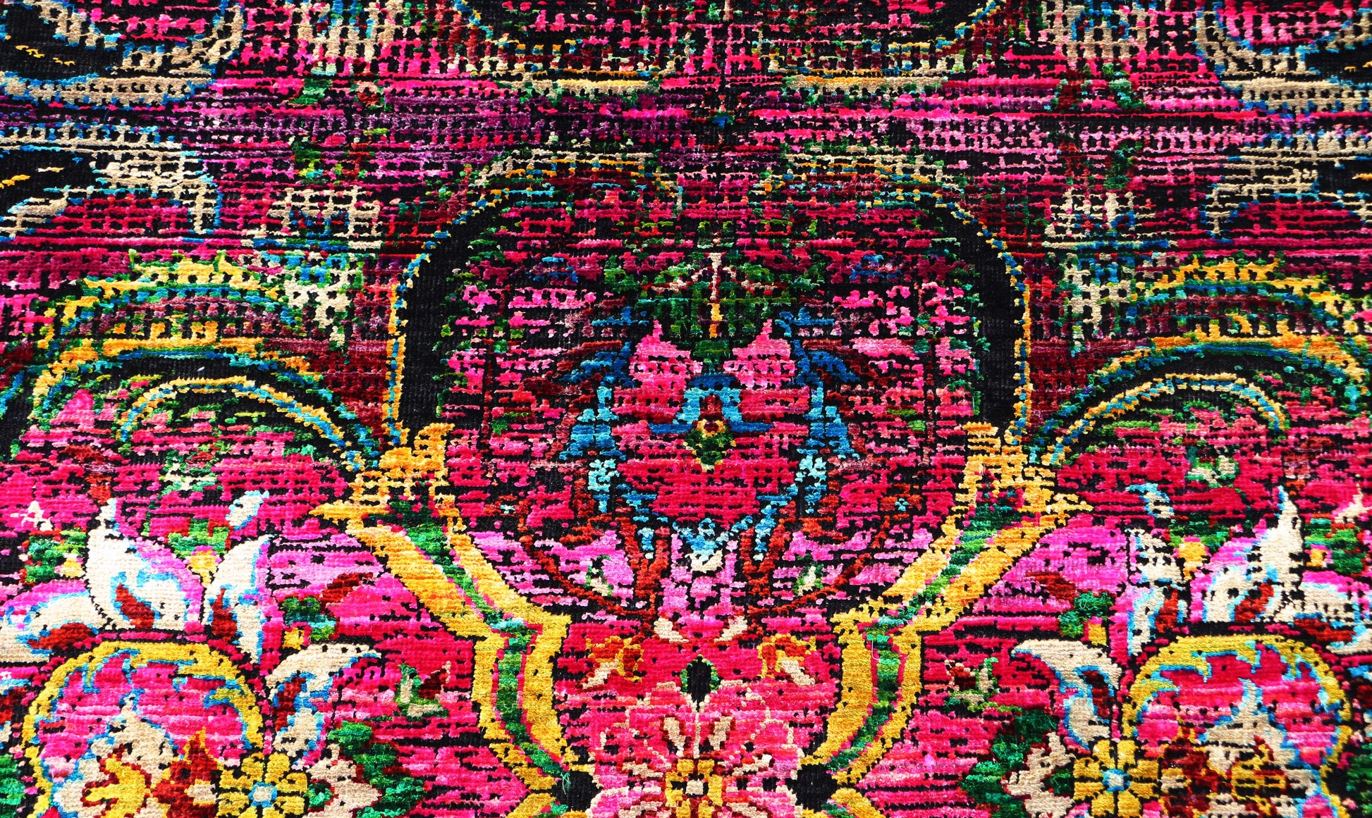 This New Hand-Knotted Rug (5' 7" x 7' 10") is a striking masterpiece that fuses a traditional Oriental/Oushak design with a contemporary distressed/vintage aesthetic. Meticulously crafted by skilled artisans, the rug features an intricate pattern of large-scale floral and medallion motifs rendered in an incredibly vibrant, jewel-toned palette, including deep fuchsia, bright pink, turquoise blue, emerald green, and saffron yellow, all grounded on a rich, dark background. The intentional "distressed" finish softens the intensity of the colors and pattern, giving the piece a rich, storied character that is both luxurious and forgiving of daily wear. This high-quality, durable hand-knotted construction makes it an ideal statement piece to add warmth, color, and global sophistication to any modern or classic living space.