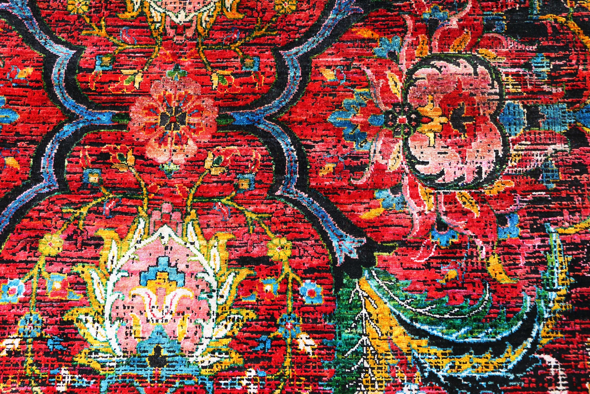 Experience the timeless grandeur of a traditional Persian design with the "Royal Heritage" hand-knotted wool rug. A symphony of color and intricate detail, this rug features a deep, captivating crimson field that is artfully distressed to reveal layers of history and character. The central medallion and overflowing floral motifs are rendered in a stunning array of vibrant blues, greens, golds, and pinks, creating a rich, jewel-toned tapestry for your floor. A meticulously detailed border frames the design, bringing the entire piece together with classic elegance. Each knot is a testament to the master artisan's skill, making this 100% woolen rug not just a décor item, but a work of art and a future heirloom.