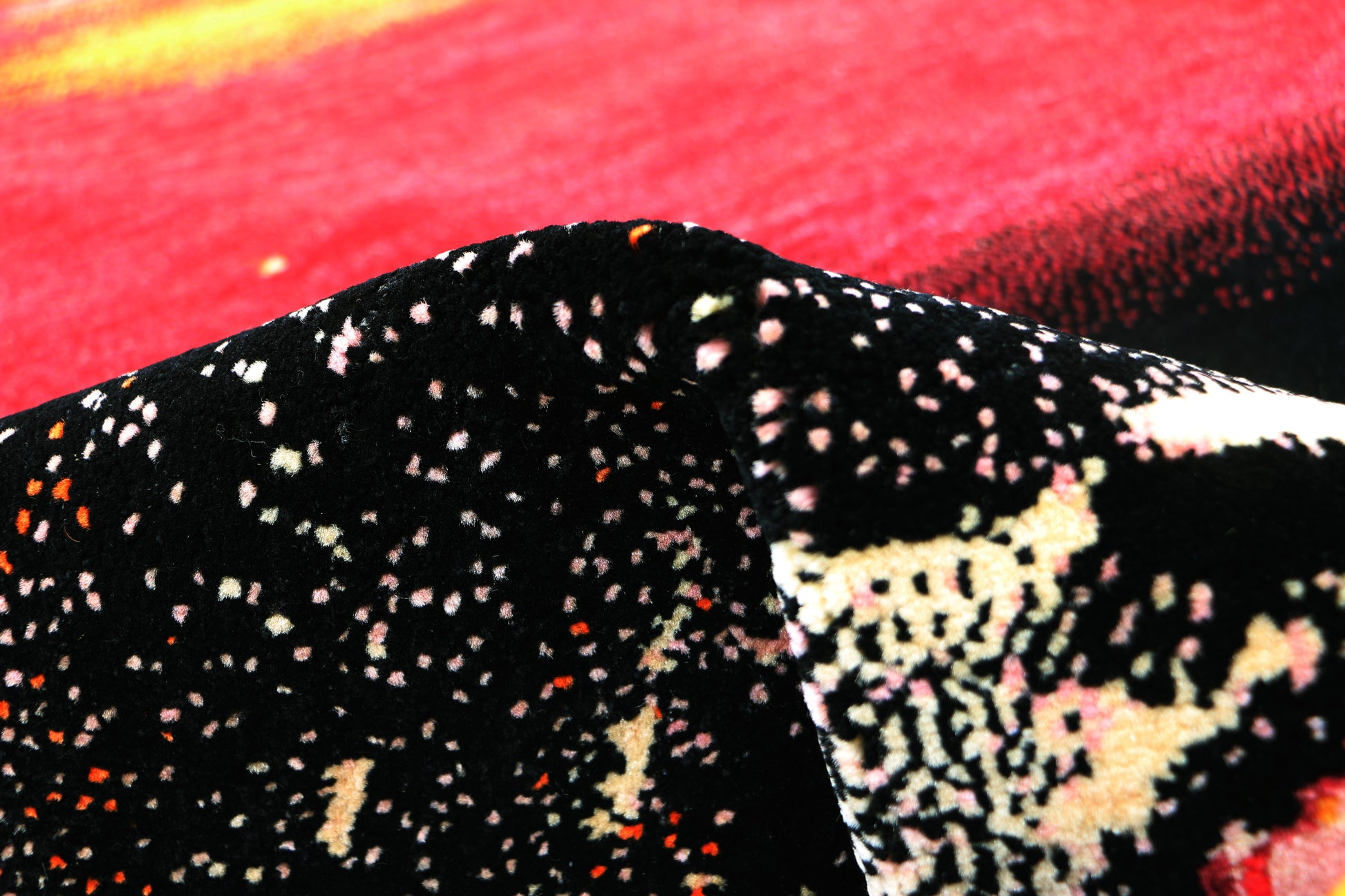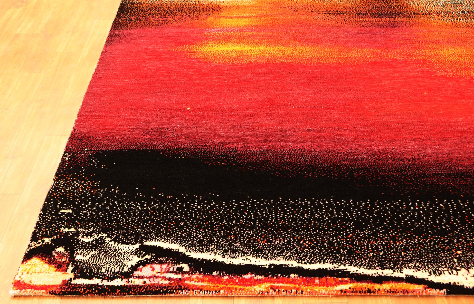 Introducing the "Sunset Mesa" hand-knotted wool rug, a breathtaking piece that captures the vibrant energy of a desert sunset. Sized at 5.7x7.10 feet (Product #5168), this rug is a masterpiece of abstract artistry. A field of intense crimson and fiery orange is beautifully blended, evoking the warmth of twilight. The colors rise and fade into a soft, glowing ivory and peach at the top, while the edges and bottom are anchored by a dramatic, mottled black and charcoal. The hand-knotted wool creates a subtle, textured surface that gives the rug a painterly quality, making it a powerful and emotional focal point in any room.